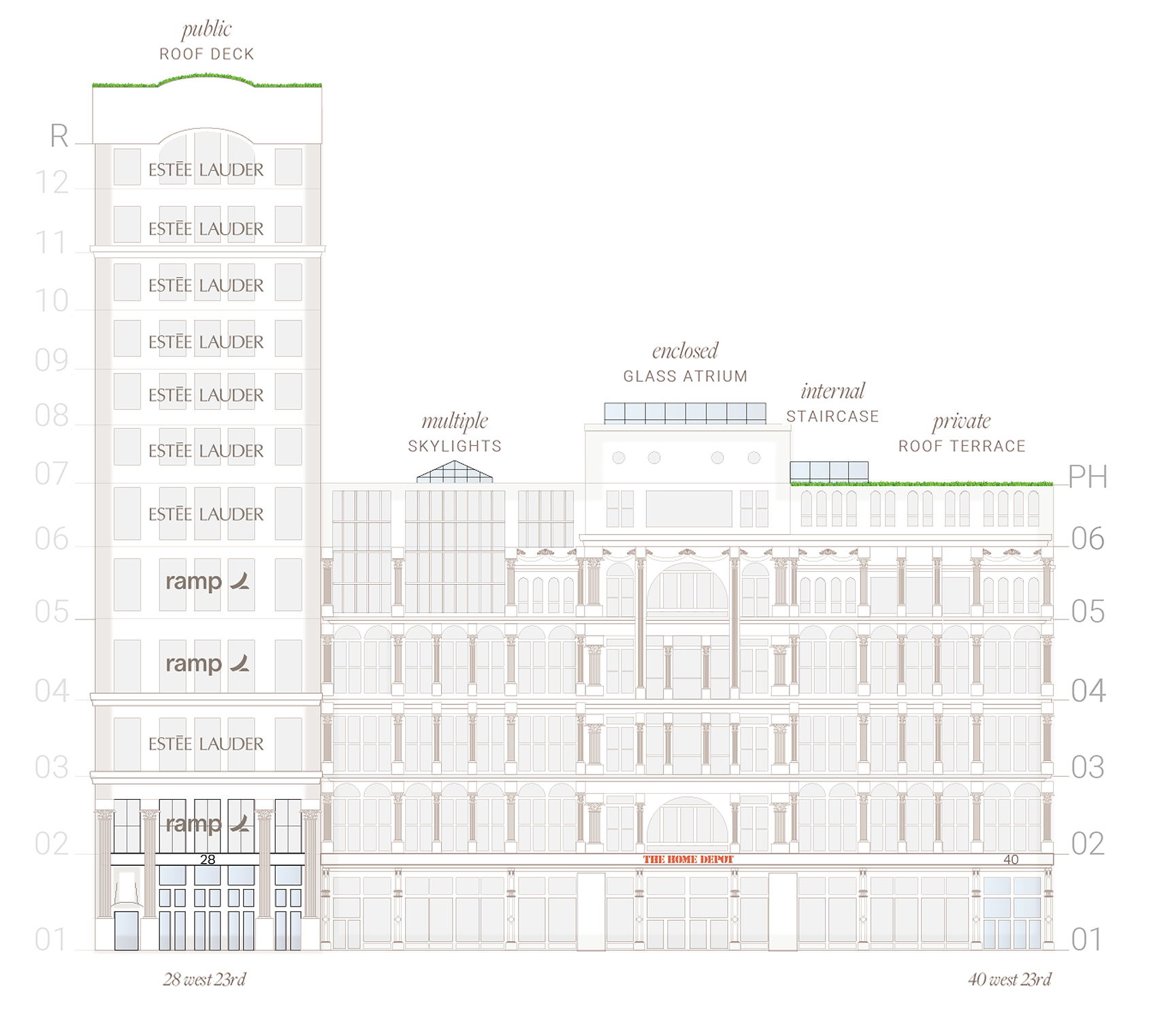 Step into an award-winning, interconnected space featuring a soaring indoor atrium, captivating architectural details like high ceilings, fluted columns, and expansive windows. Elevating the benchmark for business workspace in Flatiron/Nomad, 28/40 West 23rd stands as a symbol of excellence. Experience creative interiors adorned with an internal staircase and a private penthouse, enveloping a newly revitalized atrium. The renovated lobbies seamlessly blend restored, original building elements with contemporary finishes, creating an atmosphere exuding sophistication and style. Tailor the large and spacious floor plans to suit the specific requirements of your layout.